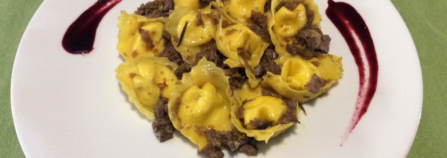 Fare mirelpoix di verdure, io per comodità le passo dal mixer e le metto in casseruola con 5 cucchiai di olio se si vuole un pezzetto di burro,e le faccio rosolare poi aggiungo la carne lavata,il vino il sale e pepe, spezie,salvia e rosmarino copro con coperchio e lascio cuocere a fuoco lento per due ore abbondanti. Finita la cottura tolgo qualche residuo di rosmarino e salvia e taglio a coltello la carne la amalgamo alle verdure. Unire burrata e ricotta sgocciolata con polvere di cappero(dissalarli asciugarli e metterli in forno a temperatura moderata con carta forno e poi sbriciolarli)e la buccia grattugiata di limone mescolare bene e mettere il tutto nella sacca da pasticcere. Nella planetaria le uova con olio e farina,facciamo poi riposare la pasta per 30′. Confezionare ravioli, io ho tenuto un quadratino di pasta con lato di 7-8 cm. E ho chiuso ad agnolotto, mirtilli lavati e fatti restringere con fuoco lento, frullati e passati al colino. In acqua bollente salata buttiamo i ravioli per qualche minuto scolare con cura ed impiattare,con letto di brasato e sopra i ravioli,decorate con ristretto di mirtilli.
