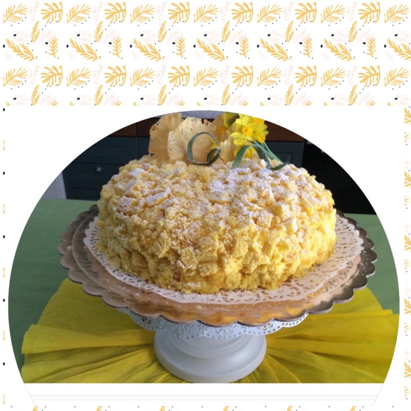 Fare del pan di Spagna 3 dischi decrescenti e tagliare i cubetti di pan di Spagna avanzato. Disporre il disco sul piatto di portata bagnarlo con succo ananas e farcire con la crema pasticcera aromatizzata, coprire con il secondo disco e ripetere l’operazione e finire con il dischetto. Coprire tutta la superficie con il resto della crema e fare aderire i cubetti di pan di Spagna e decorare a piacere.