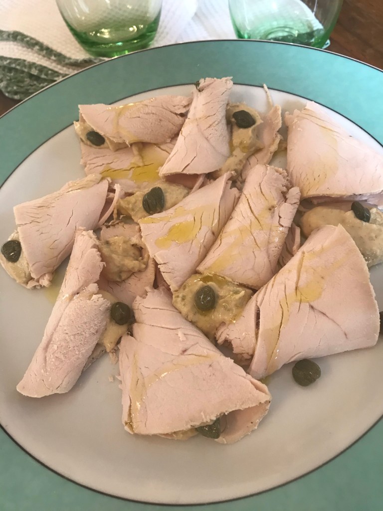 Sgocciolare bene il tonno dal suo olio,dissalare o lavare con cura i capperi e metterli nel frullatore con l’acciuga il succo di limone e i tuorli e un po’ di olio evo,frullare con cura per amalgamare bene tutti gli ingredienti e quindi regolare di sale e se necessario aggiungere altro olio. Adagiare sul piatto le fette di tacchino e quindi versarci sopra la salsa e conservare in frigorifero fino al momento del consumo,guarnire il piatto con alcuni capperi.
