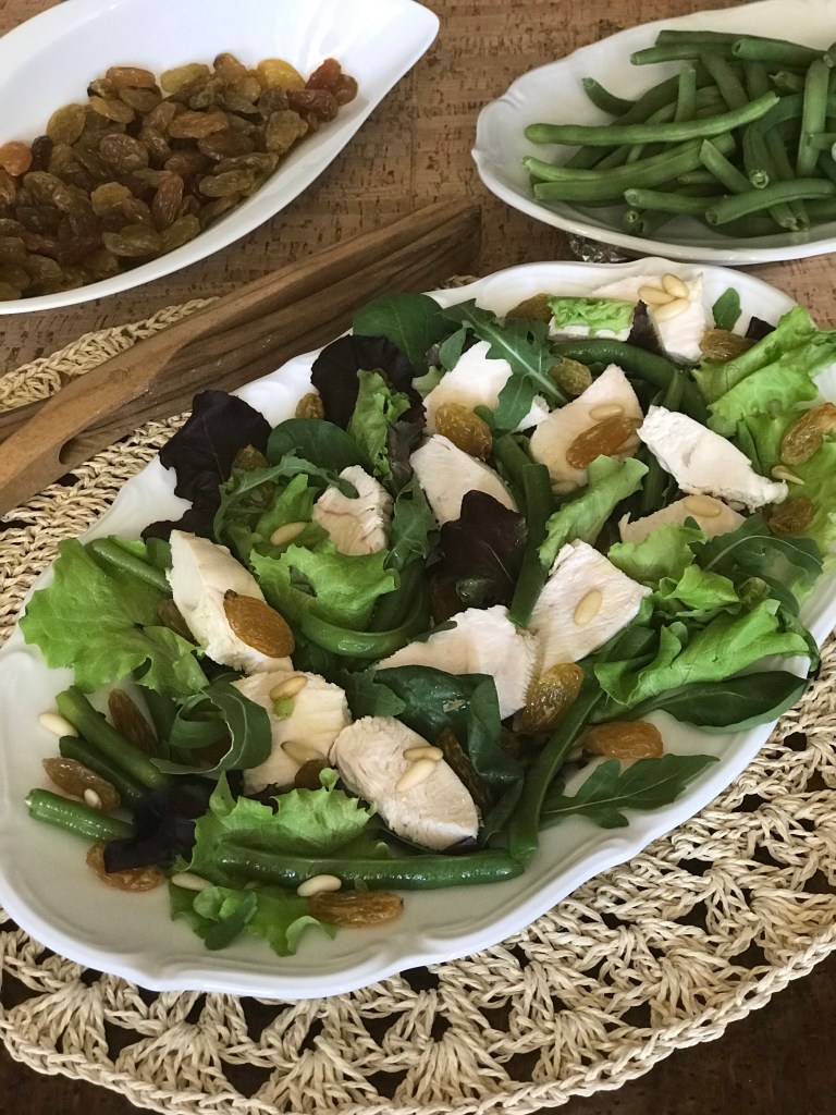 Preparare il brodo con la carota,la cipolla e il sedano facendoli lessare 20 minuti in due litri di acqua salata,scolare le verdure e nello stesso brodo cuocere per 15 minuti il petto di pollo poi scolarlo e farlo raffreddare,tagliarlo a pezzetti uniformi.Mettere ad ammollare l’uvetta in acqua tiepida,spuntare i fagiolini lessarli per circa 8/10 minuti in acqua bollente salata e poi scolarli. Riunite in un piatto da portata o in un’insalatiera i fagiolini, i pezzetti di pollo l’uvetta strizzata,i pinoli e l’insalata mista. Condire con la salsa preparata emulsionando olio,aceto e qualche pizzico di sale e pepe. Mescolare e servire!
