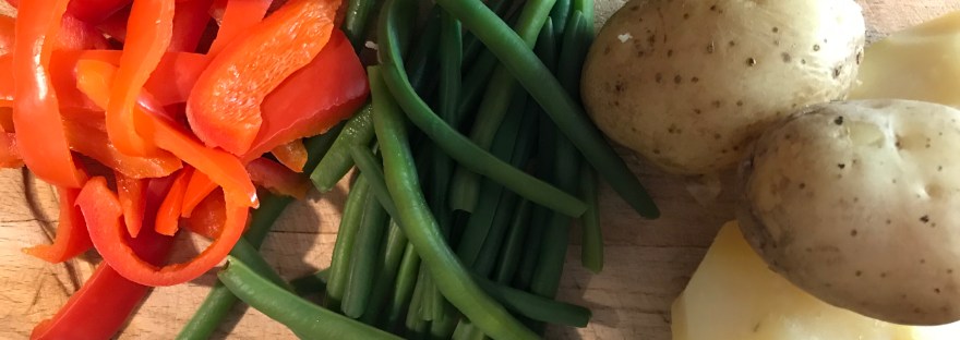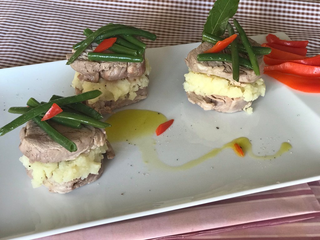 Lavare le patate e cuocerle al vapore con la buccia per 30 minuti,poi sbucciarle e schiacciarle con una forchetta o schiacciapatate,condirle con olio,pepe e sale. Lavare e spuntare i fagiolini,cuocerli per 7 minuti al vapore,scolarli e passarli in padella con un filo di olio e regolare di sale e pepe. Lavare anche il peperone tagliarlo a pezzetti o striscioline,come si desidera,poi portare ad ebollizione in un pentolino un bicchiere grande di acqua e mezzo di vino bianco secco e una manciatina di sale grosso,al momento del bollore aggiungere i peperoni,scottarli per qualche minuto e poi scolarli e lasciarli raffreddare. In una padella cuocere per 8 minuti i medaglioni di filetto con un pizzico di sale,un filo d’olio e alcune foglie di alloro. Quando tutto sarà pronto comporre ogni singola torretta sistemando sul fondo di un piatto da portata una fettina di filetto poi uno strato di patate schiacciate,un’altra fetta di filetto e per ultimo i fagiolini saltati,guarnire i piatti con il peperone rosso.