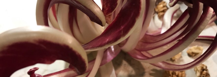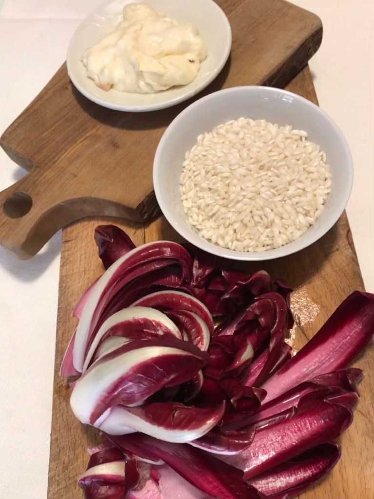 Il risotto con radicchio taleggio e noci è un primo piatto autunnale,facile e gustoso,un connubio perfetto di consistenze dove il gusto rustico delle noci incontra quello cremoso del taleggio che di sicuro soddisfa anche i palati più esigenti. Il radicchio trevigiano o radicchio di Treviso è un ortaggio Italiano che tutto il mondo ci invidia di colore rosso sgargiante,con un suo sapore amarognolo che si abbina facilmente a molti altri ingredienti,esistono due tipi di radicchio:il precoce e il tardivo ed entrambi raccolti in autunno,per essere poi portati sulle nostre tavole,si adatta a una miriade di preparazioni e con le diverse cotture,ma anche consumato crudo è una vera eccellenza. Il Taleggio invece è un formaggio di origine Lombarda a denominazione di origine protetta D.O.P È un formaggio grasso a pasta cruda prodotto con latte vaccino intero,dal sapore dolce e burroso con una nota acidula leggermente aromatica,la crosta sottile e la pasta uniforme compatta di colore bianco paglierino con qualche piccola occhiatura un tipico formaggio da tavola versatile,consumato come secondo piatto,ottimo anche accompagnato da frutta,come mele e pere.Prende il nome dall’anonima valle situata nell’alta Bergamasca,inizialmente questo formaggio veniva chiamato stracchino,questo termine deriva dall’espressione dialettale”stanco”e probabilmente richiamava le condizioni delle mucche che scendevano in pianura dopo la lunga permanenza in alpeggiò