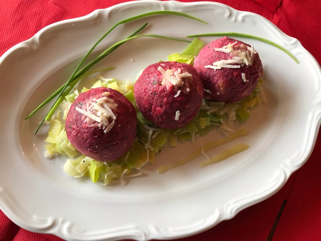 Servire i canederli di barbabietola con dei porri stufati o con una salsina di panna con erbe aromatiche. Non lasciare i canederli troppo nell’acqua di cottura,altrimenti potrebbero perdere il loro colore.