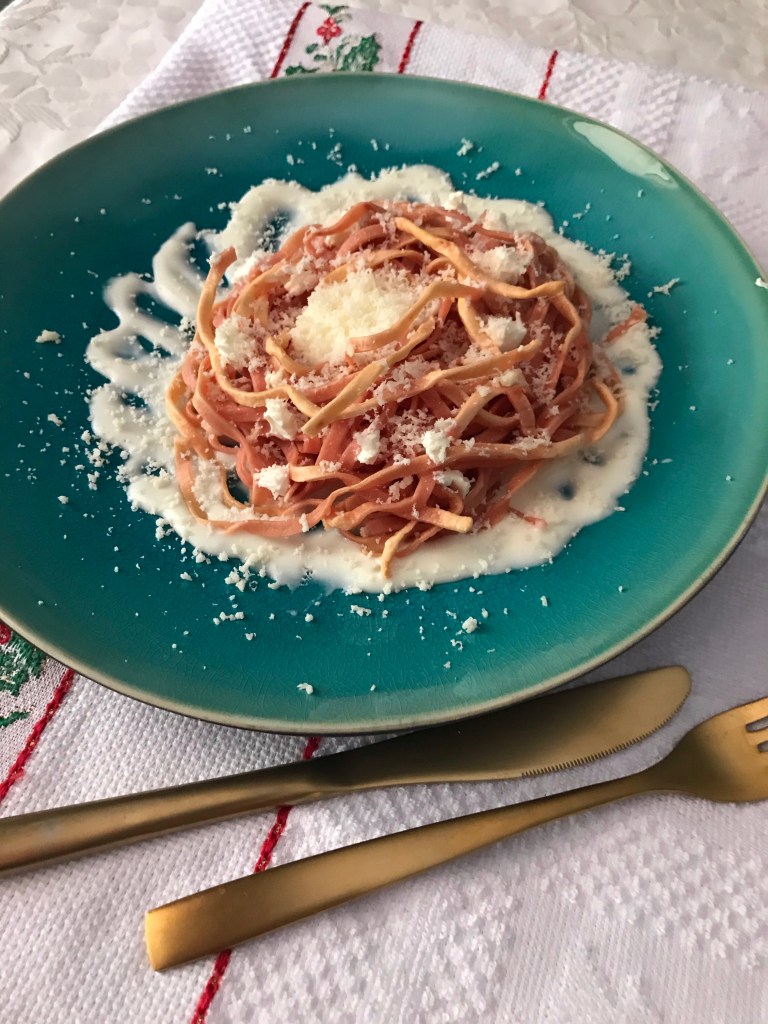 Sbucciare la rapa e passarla al passaverdure e formare una purea,versare in planetaria le uova intere,l’olio,il sale,la purea di rape e per ultimo la farina,azionare la macchina e lavorare l’impasto,fino a formare una palla liscia e omogenea,lasciarla riposare almeno per un’ora. Fare la besciamella,facendo sciogliere il burro a fuoco lento,aggiungere lentamente la farina mescolando con frusta a mano e poi incorporare anche il latte tiepido,quando ha raggiunto il bollore aggiungere due pizzichi di sale e una grattugiata di noce moscata. Con l’apposita macchina ricavarne dei tagliolini,che andranno cotti in abbondante acqua salata finché torneranno a galla. Imburrare una pirofila,disporre sulla base abbondante besciamella e collocare sotto forma di nidi i tagliolini arricchendoli con fiocchi di ricotta vaccina,un cucchiaio di besciamella al centro e con una pioggia di formaggio grattugiato.