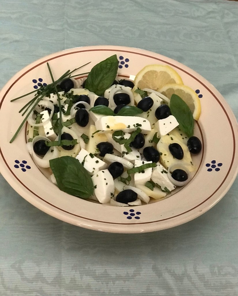 Lessare le patate con le bucce in acqua salata per circa 25 minuti fino a quando saranno tenere ma non sfatte,scolarle e sbucciarle e lasciarle raffreddare. Tagliare il primo sale a cubotti,mondare i cipollotti dalla parte verde e tagliarli ad anelli abbastanza sottili,sfogliare i rametti di menta e prezzemolo,tritarli insieme. Riunire in una grande insalatiera le patate intere o anche tagliate a rondelle i cipollotti,le olive,il formaggio,il trito aromatico e mescolare con cura con due cucchiai,riunire in una ciotola l’olio il succo di limone,la senape un pizzico di sale un po’ di pepe,sbattere tutto questo per alcuni minuti fino ad ottenere una salsina densa e omogenea. Condire L’insalata con questa salsina,profumare con le foglie di basilico anche spezzettate e servire.