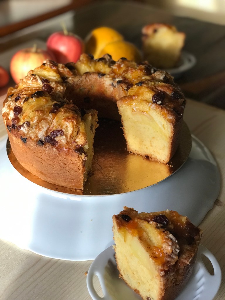 Lavare uvetta,asciugarla su carta assorbente e poi metterla a bagno nel succo di mezza arancia,imburrare uno stampo da ciambella da 26 cm,preparare la cannella e unirla a un cucchiaio di zucchero,sbucciare e unire le fettine di mela a due cucchiai di zucchero e un cucchiaio di succo d’arancia. In una ciotola unire le uova intere allo yogurt,allo zucchero,al latte e all’olio,sbattere tutti gli ingredienti anche con le fruste elettriche,unire la farina setacciata e la buccia grattugiata di un’arancia,il lievito passato al colino e per ultimo l’uvetta strizzata(tenendo a parte un poca per la guarnizione) amalgamare il tutto e versare l’impasto nella teglia,livellarlo e aggiungere a questo punto le fettine di mela a raggiera e sopra di esse distribuire l’uvetta rimasta e alcune manciate di granella di zucchero e per ultimo la cannella mescolata allo zucchero. Infornare la ciambella a 180°per 35/40 minuti in modalità statica. Quando la torta avrà raggiunto la sua cottura,toglierla dallo stampo e ancora calda spennellarla con la confettura di albicocche.