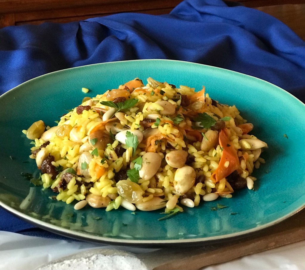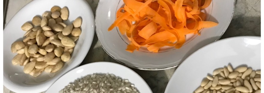 Lasciare a bagno l’uvetta in una ciotola con acqua tiepida per almeno 20 minuti,spuntare la carota e tagliarla a striscioline nel senso della lunghezza con un pelapatate. Fare tostare le mandorle e poi i pinoli in un tegamino antiaderente,tritare gli scalogni e rosolarli in un tegame con l’olio,unire la carota,la frutta secca,l’uvetta scolata,il prezzemolo tritato grossolanamente,il sale e il pepe,lasciare insaporire a fuoco vivace per alcuni minuti. Lessare il riso al dente in acqua salata portata a bollore con lo zafferano,scolarlo e versarlo nel tegame con il condimento,lasciarlo insaporite per qualche minuto a fuoco vivace e servire.