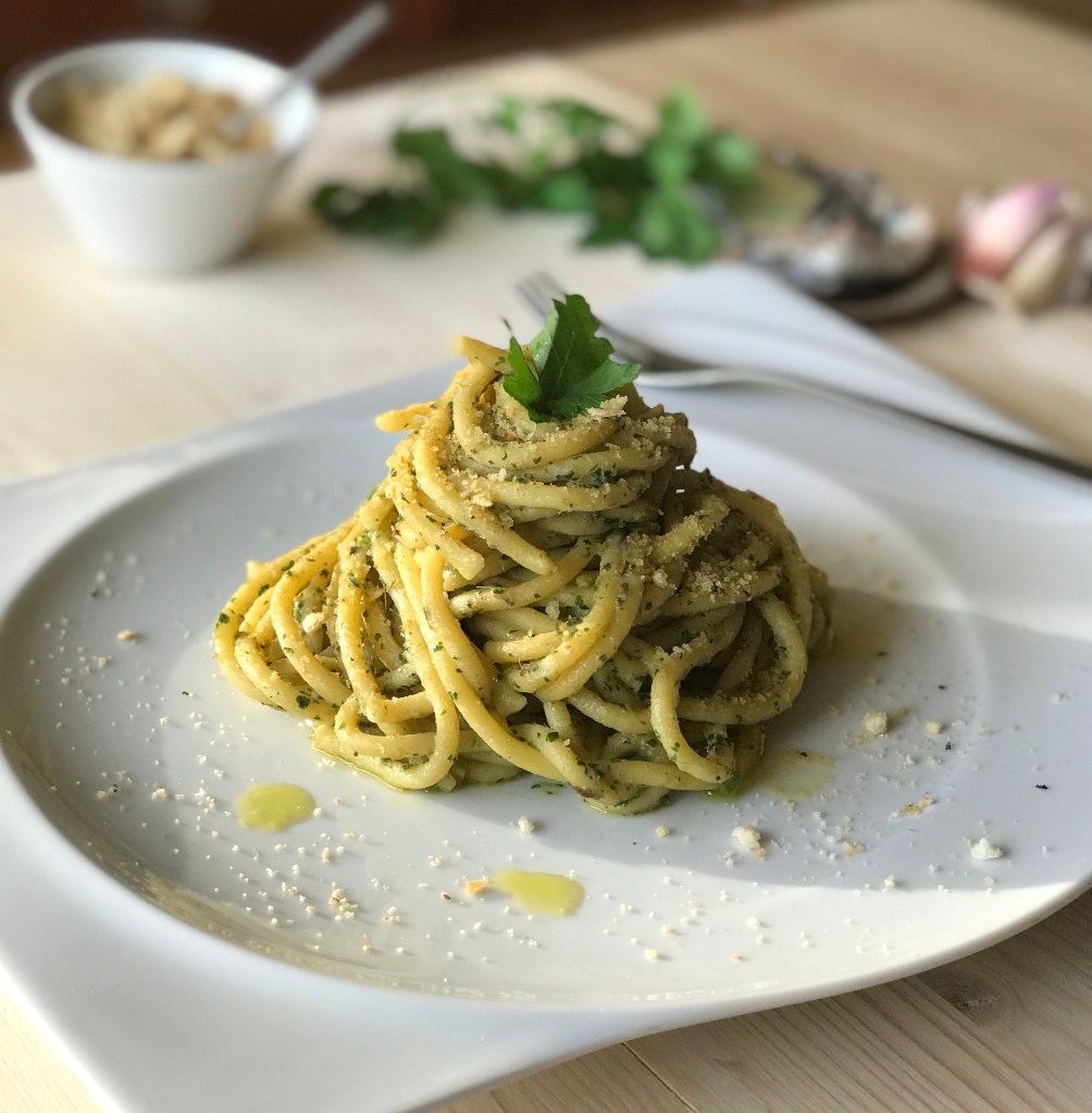Rosolare l’aglio nell’olio in una padella piuttosto grande,togliere dal fuoco ed unire i filetti di sarde pulite in precedenza,scioglierle mescolando con un cucchiaio di legno,unendo un goccio di brandy e fiammeggiare,unire anche il prezzemolo. Tostare il pane grattugiato (alcuni cucchiai) in un’altra padella con un po’ di olio,sale ed origano. Cuocere i bigoli in acqua salata e condirli in padella con la salsa di sarde. Impiattare i bigoli cospargendoli di pane tostato profumato all’origano e Bon Appetit!!