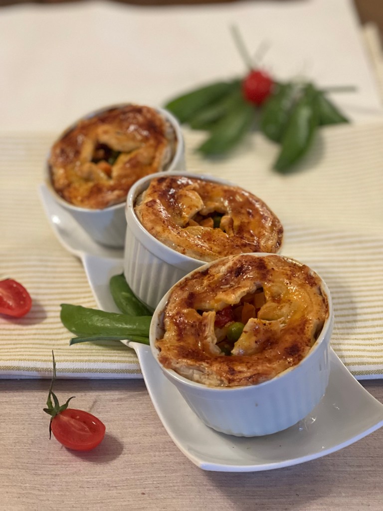 Sgocciolare il tonno dal liquidò di conservazione, quindi spezzettarlo con i rebbi di una forchetta. Sbollentare i piselli per cinque minuti in acqua bollente salata. Mondare sedano e carota, tritarli finemente e farli dorare in una padella con due cucchiai di olio extravergine di oliva. Togliere dal fuoco, lasciare intiepidire unire i piselli,i pomodori secchi, il tonno,mescolare,aggiungere la maionese ed il pomodoro essiccato,tenerne una parte per decorare la superficie,quindi salare e volendo pepare. Srotolare la pasta sfoglia e ricavarne quattro dischi di circa 10 cm di diametro, distribuire il composto di tonno in quattro stampini di ceramica individuali, coprire con la pasta sfoglia e saldarla bene al bordo dello stampino,fare un taglio a croce sulla superficie,spennellarla con il tuorlo leggermente sbattuto,a piacere aggiungere la polvere di pomodoro, cuocere in forno a 180° per 15 minuti circa,fino a quando la crosta sarà bella dorata,servire il pasticcio tiepido o freddo.
