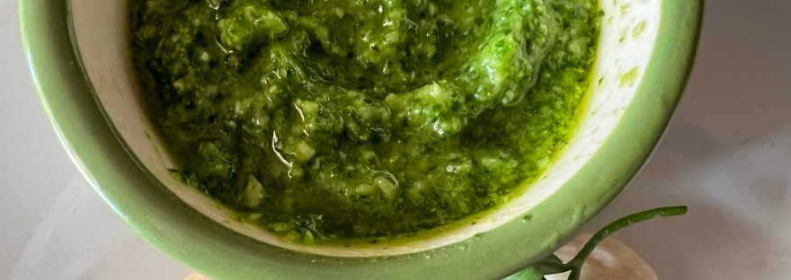 Lo spicchio di aglio, l’olio e il succo di limone, frullare il tutto, assaggiare e regolare di sale e se necessario frullare ancora finché diventerà un pesto omogeneo