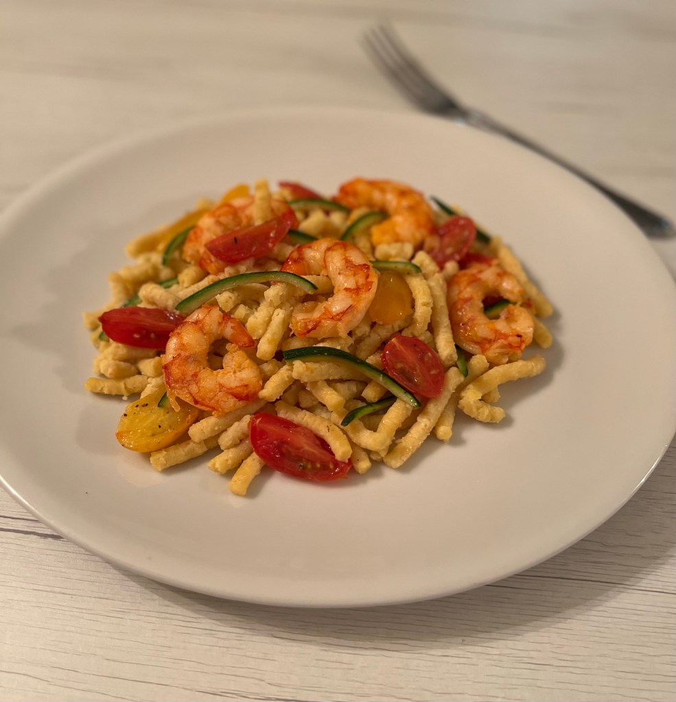 Mescolare in una ciotola il pangrattato con il grana e la scorza di limone grattugiata,unire le uova sbattute con sale, pepe e noce moscata e lavorare l’impasto con le mani, fino a ottenere un composto omogeneo,avvolgerlo con una pellicola e metterlo in frigorifero. Pulire i gamberi, eliminare il carapace e il filetto nero e saltarli in padella con un filo d’olio e poi tenerli da parte. Tagliare il verde della zucchina a bastoncini e saltarli velocemente nella stessa padella con sale e pepe. Tagliare i pomodorini a spicchi e procedere allo stesso modo, poi riunire tutto in padella. Formare i passatelli: passando il composto attraverso l’apposito attrezzo o lo schiacciapatate con buchi grandi, poi cuocerli in acqua bollente salata o in brodo anche vegetale, per pochi minuti finché verranno a galla. Scolarli e aggiungerli,nella padella con un filo d’olio,regolare di sale e pepe,farli insaporire e servire con la maggiorana