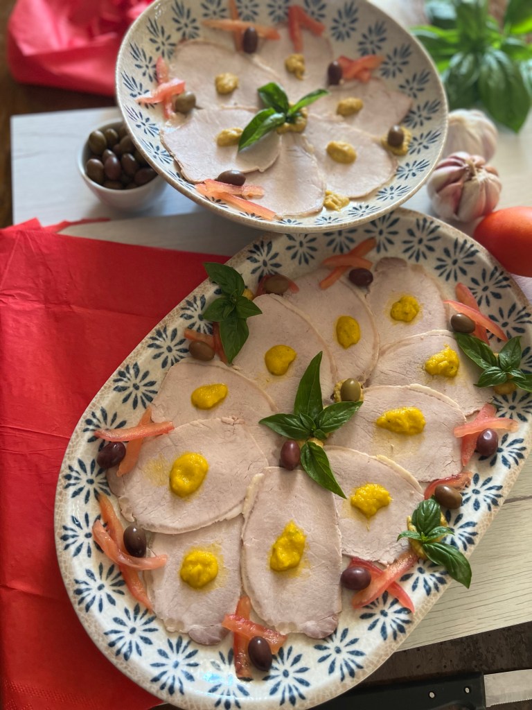 Togliere la pellicola dalla lonza,tagliarla a fettine sottili, sistemarle sul piatto da portata, versarci sopra la salsina tiepida, lasciare riposare per 20 minuti e decorare il piatto con i filetti di pomodoro e con le olive.