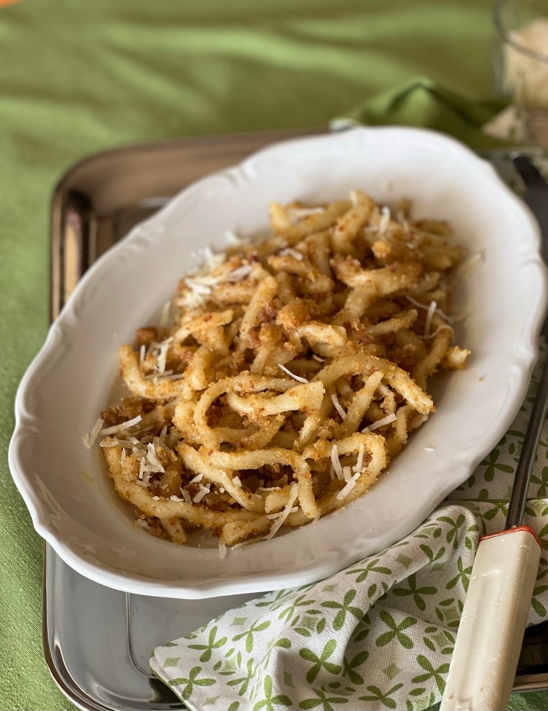 Lessare i pici in acqua bollente salata. Pestare le fette di pane fino a ridurle in briciole, tostatarle in padella con l’aglio vestito e mezzo bicchiere di olio. Unire i Pici appena scolati, mescolare e servire con pecorino grattugiato,pepe a piacere.