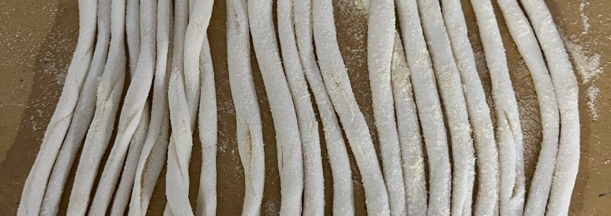 Dividere il panetto in sei porzioni,stendere la prima in una sfoglia di 1,2 cm di spessore e tagliarla a striscioline. Prenderne una fra le mani, con la sinistra tenere sollevata l’estremità e con la destra fare rotolare la striscia sotto il palmo per formare il Picio,continuare così fino all’esaurimento dell’impasto e man mano che sono pronti cospargerli con la farina