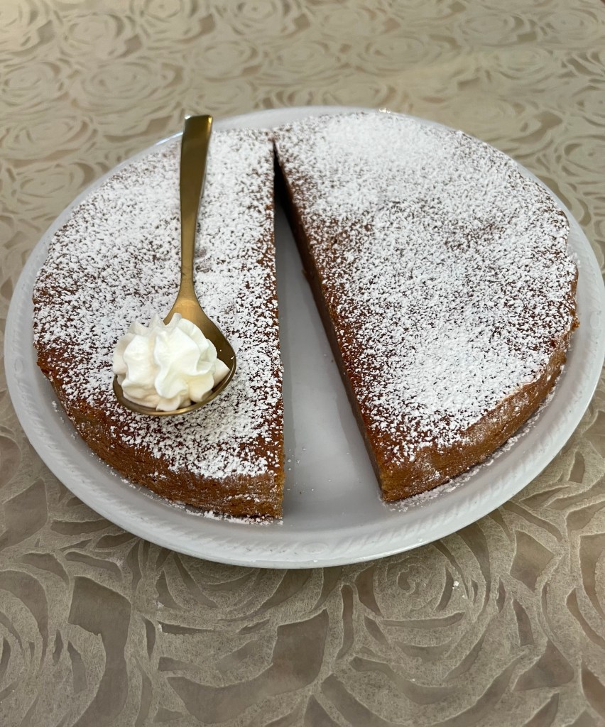Servire la torta cosparsa di zucchero velo con la panna montata a parte