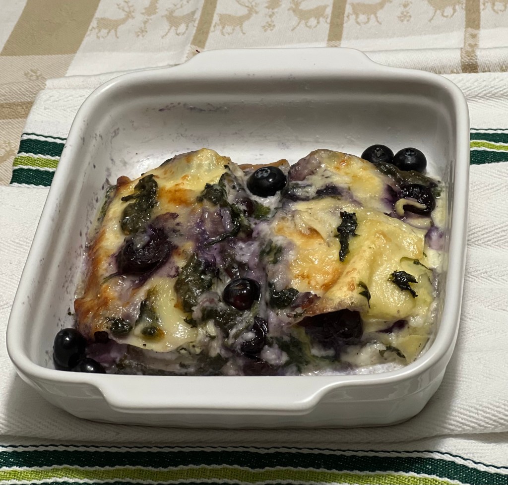 Cospargere con un po’ di besciamella e proseguire a realizzare gli strati fino ad esaurimento degli ingredienti,terminando con una spolverizzata di Parmigiano e qualche fiocchettò di burro. Infornare a 170° e cuocere per circa 35/40 minuti. Trascorso il tempo di cottura spegnere il forno e lasciare riposare la lasagna per circa 10 minuti. Quindi sformarla tagliarla a fette,guarnire con i mirtilli tenuti da parte e servire.