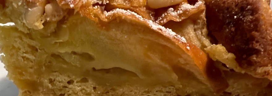 Montare gli albumi con il pizzico di sale e tenerli da parte nel frigorifero. A parte sbattere bene i tuorli con lo zucchero,fino ad ottenere un composto spumoso,poi aggiungere i due cucchiai di burro a temperatura ambiente,la buccia del limone grattugiata,amalgamare bene aggiungendo anche la farina e il lievito setacciati ed aggiungere anche le 2 mele tagliate a dadini e gli albumi montati a neve, girare l’impasto delicatamente per inglobare aria. Versare l’impasto in uno stampo ricoperto di carta forno di cm. 24 e per ultimo aggiungere in superficie le mele tagliate a fettine e disporle a raggiera e sopra le mele adagiare alcuni fiocchetti di burro e pinoli,infornare la torta in modalità statica,nel forno già preriscaldato per 60 minuti a 160°/170. Allo scadere del tempo controllare cottura con lo stecchino che dovrà risultare asciutto. Lasciare raffreddare la torta nello stampo per poterlo sformare e poi guarnire con zucchero a velo vanigliato.