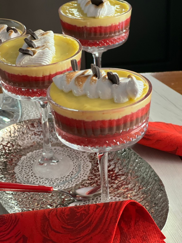 Si inizia col fare la crema pasticcera: montare tuorli con zucchero e vaniglia usando le fruste elettriche per ottenere un composto spumoso,aggiungere poi a questo composto fecola e maizena setacciate. Poi in una casseruola capiente miscelare i 200 gr di panna con 800 gr di latte e portare sul fuoco,raggiunta ebollizione versare il composto di tuorli e polveri,girare velocemente con la frusta a mano e in pochi secondi la crema sarà pronta. Dividerla subito in 2 parti più o meno uguali ed a una di esse aggiungere il cioccolato tagliato sottile in modo che si sciolga velocemente sempre giando con la frusta,raffreddare il tutto. Assemblare il dolce: bagnare i dischetti di pan di Spagna con il liquore rosso posizionarli sul fondo di una coppa di vetro e sopra fare un piccolo strato di cioccolato e poi ancora un’altro dischetto inzuppato di liquore e sopra altro strato di crema pasticcera,e per terminare guarnire con meringhe cioccolato o altro.