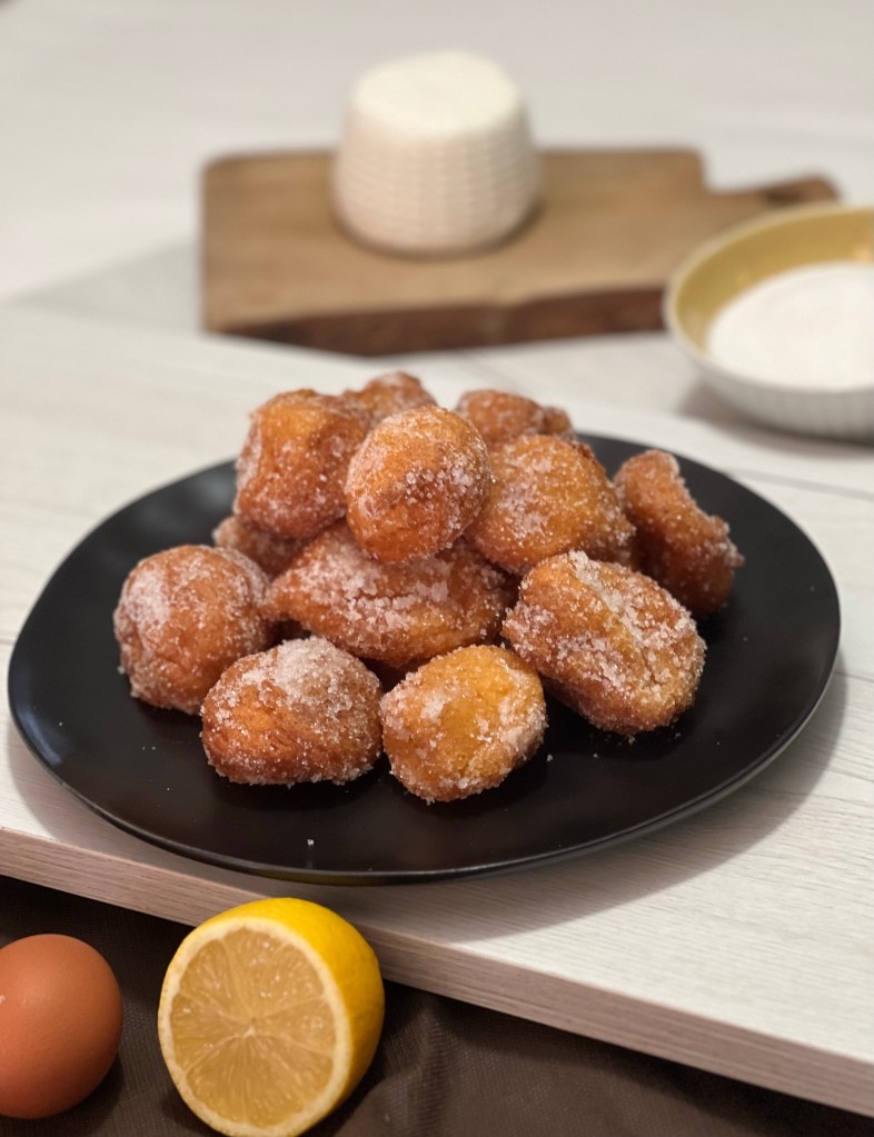 Mettere a colare e asciugare la ricotta il più possibile,poi metterla in una ciotola e lavorarla con una frusta,aggiungere poi lo zucchero,le uova e la scorza grattugiata del limone. In un’altra ciotola setacciare la farina e il lievito e unire poi il tutto alla ricotta,mescolare bene per ottenere un impasto densò. Scaldare l’olio e prelevare man mano un pochino di impasto aiutandoci con un cucchiaio,friggere le frittelle poche per volta girandole in modo che si colorano in modo omogeneo. Scolarle e posarle su carta assorbente e rotolarle ben calde nello zucchero semolato.