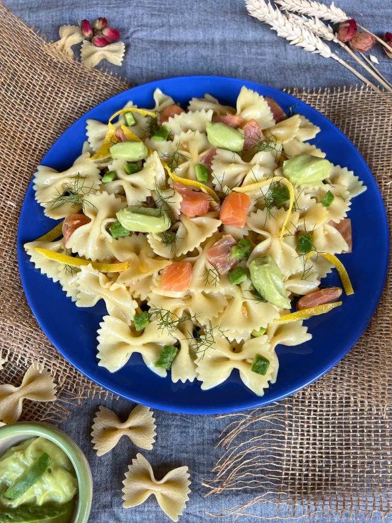 Portare a bollore in una pentola,abbondante acqua salata,lessare la pasta per 10 minuti o quanto indicato sulla confezione. Tagliare poi gli avocado a metà e togliere il seme,raccogliere la polpa con un cucchiaio e frullarla nel mixer con un cucchiaio di olio,un pizzico di sale e pepe,aggiungere anche il succo del limone e tenere da parte la scorza. Coprire la crema a contatto con pellicola e tenerla in frigorifero. Tagliare a fettine o cubetti il filetto di salmone e mescolarli a un cucchiaio di olio e alla senape,unire anche le foglie di aneto o finocchietto fresco sminuzzate. Scolare la pasta al dente,raffreddarla sotto acqua corrente. Condirla in una pirofila,con i cubetti di salmone,completare con la crema di avocado a cucchiaiate,cospargere con le zeste di limone e servire. CONSIGLIO: Il salmone lo potete trovare in un pratico formato,un trancetto ricavato dalla parte centrale del salmone affumicato. Davvero comodo