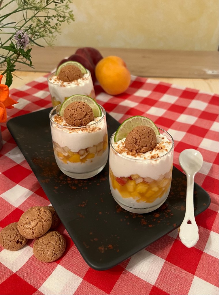 In una ciotola mettere lo yogurt greco,2/3 foglie di menta tritata bene e mescolare,aggiungere la panna montata e amalgamare mescolando con una spatola delicatamente. Prendere i bicchieri e riempirli a strati,alternando le tipologie di pesche,la crema e gli amaretti sbriciolati. Terminare con ciuffetti di crema,decorare con piccole fette di lime e amaretti