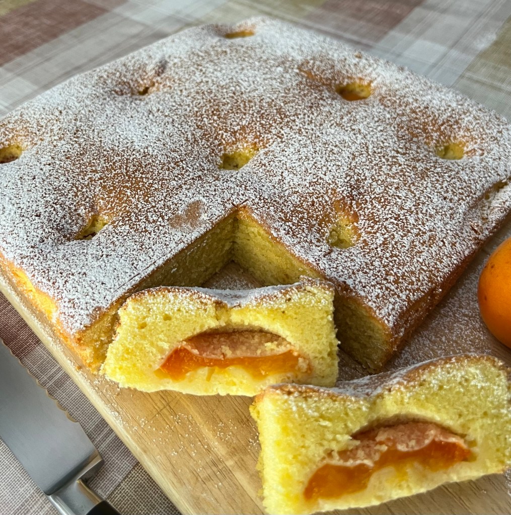 Il composto dovrà essere sostenuto,versare l’impasto nello stampo con carta forno o imburrato, livellarlo e adagiare le albicocche,lasciandole a metà.cuocere la torta in forno già preriscaldato in modalità statica a 180°per 35 minuti finché il dolce diventerà gonfio dorato.