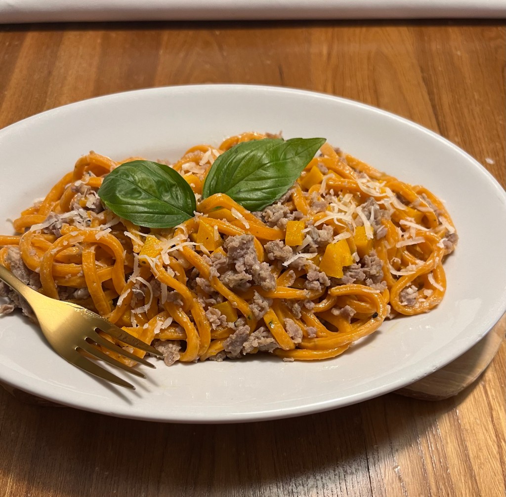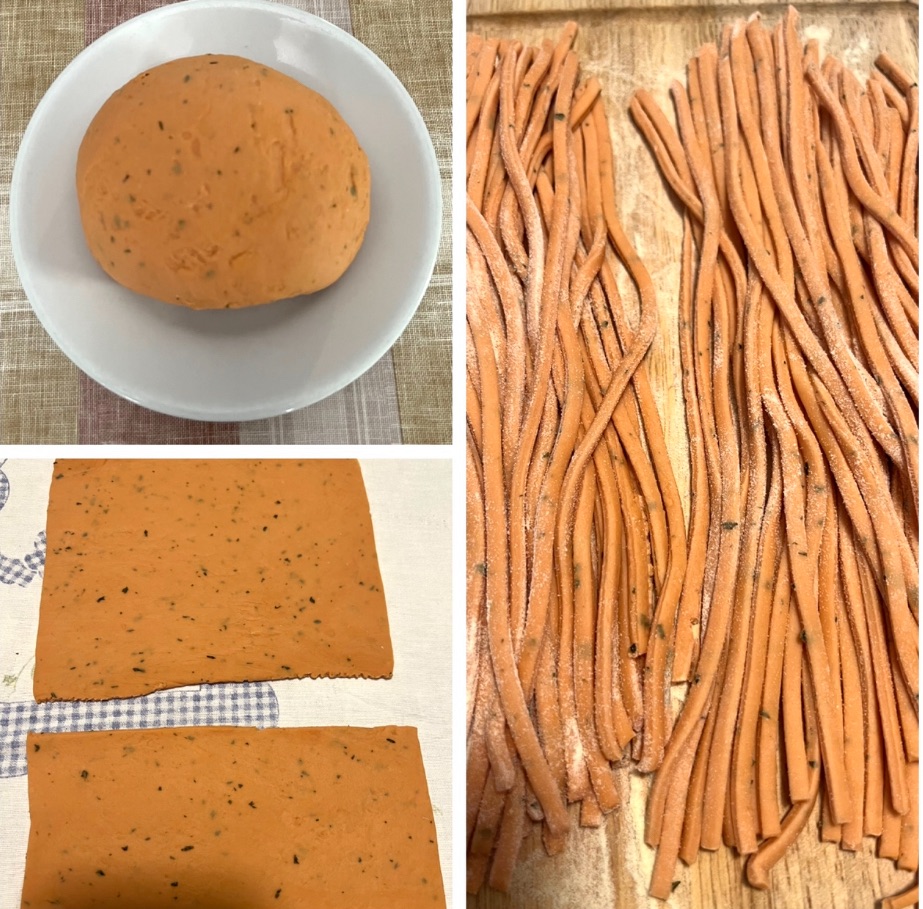 Allora,aggiungo agli ingredienti dell’impasto 55gr di triplo concentrato di pomodoro,🍅 ma però tolgo 55 gr di latte ( 225-55=)170 gr di latte da usare più il pomodoro,mantenere lo stesso procedimento. In questo modo si avrà una pasta bella colorata e particolare da abbinare ai diversi sughi.