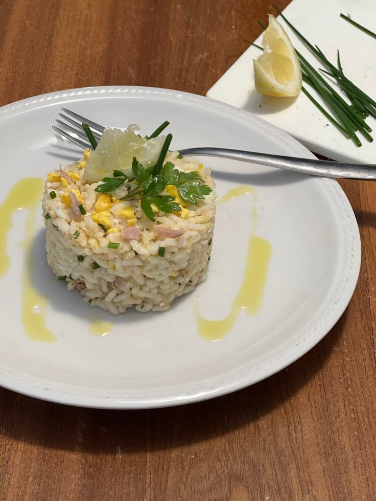 Mettere il riso scolato bene, in una ciotola ed emulsionarlo con l’olio e il succo di limone,mescolare ed aggiungere anche il tonno sminuzzato le uova sode spezzettate,l’erba cipollina e il prezzemolo fresco tritato.
